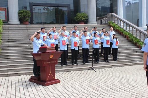 5月10日上午11时许,掇刀区法院首批计入员额的16名法官,在党组书记、院长唐崇德的领誓下,面向国旗站立,铿锵有力地作出庄严宣誓。